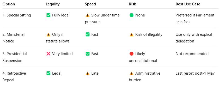 This is procedurally heavy, but constitutionally clean and immune from judicial challenge. However, the clock is working against this option unless the sitting is convened immediately and cross-party consensus is secured to expedite the process.